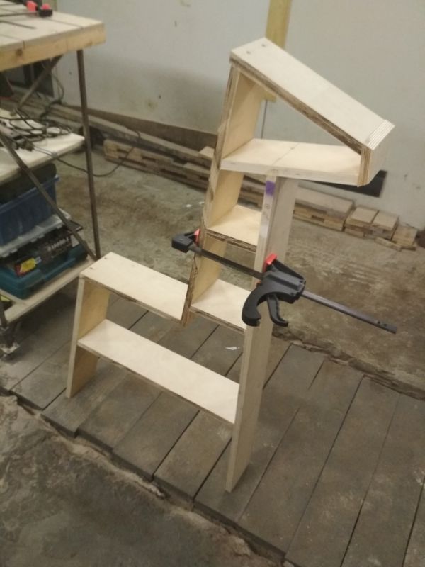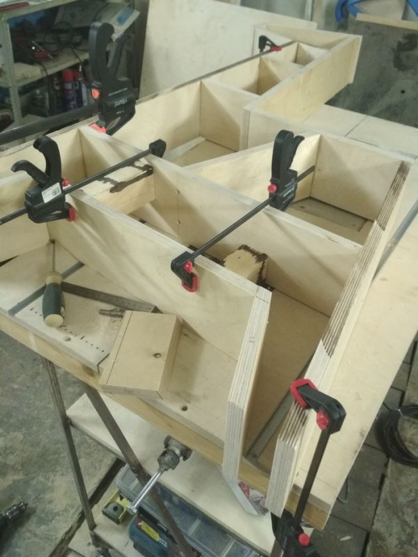 Идею подсмотрел на пинтересте, а чертеж и размеры накидал сам. Из материалов нужно было раскроенный лист 18-й шлифованной фанеры из Леруа, клей, и саморезы со шкантами в количестве 40 штук, шпаклевка и краска. Инструмент: распиловочный стол, транспортир, дрель, отвертка, струбцины и шлифмашинка со шкуркой. С размером я чуток промахнулся и на рабочем столе полка выглядит несколько громоздко.