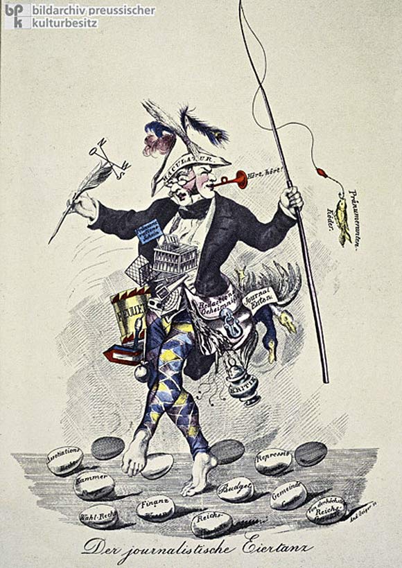 Суть карикатуры в следующем. Наполеон, частично оккупировав, а частично подмяв под себя немецкие государства, ввёл строжайшую цензуру в прессе, чтобы не допустить и малейших попыток немецкой консолидации (национализма). Но даже после ликвидации Наполеона, эти меры цензуры продержались вплоть до революции 1848 года. В данной карикатуре отражено, как журналист вынужден ловко обходить неудобные вопросы, опасаясь тюремного срока. Среди вопросов: вопрос о выборах, вопрос о свободе объединений, вопрос о бюджете и т.д.