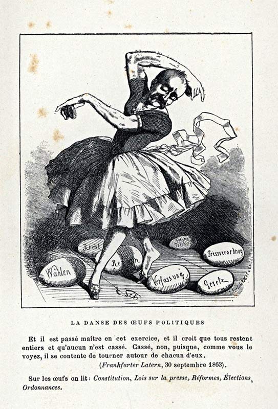 Карикатура 1863 года на Бисмарка в пачке, танцующего между яйцами.