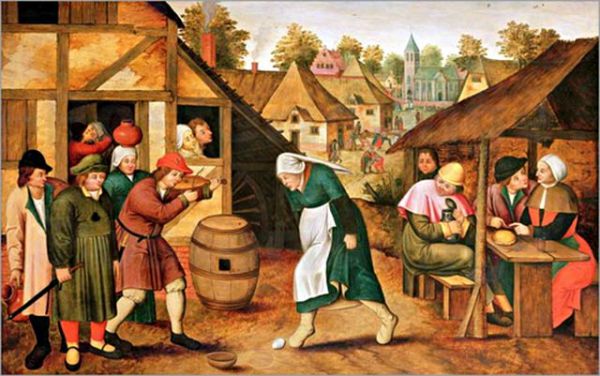 В данном случае грубым крестьянским танцам противопоставляется ловкость танцора с яйцами. Чтобы усилить эффект, танцор ещё балансирует бутылку на своей голове.