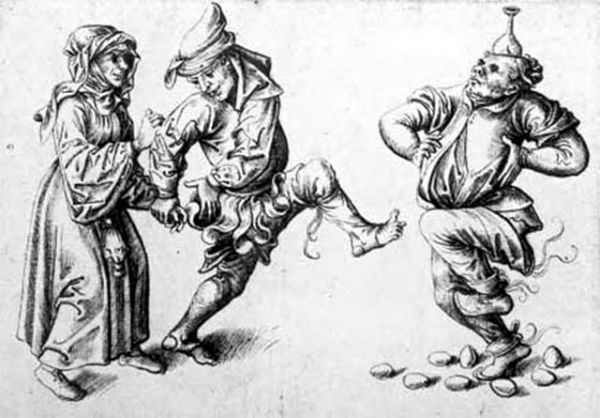 Танец крестьян и танец с яйцами. Верхний Рейн, около 1510 года. Рисунок чернилами пером на бумаге: