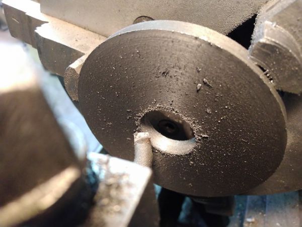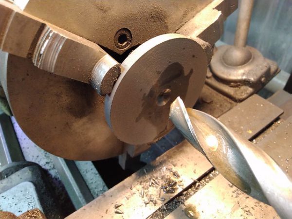 Теперь надо просверлить дырку для подшипника. Предвидя, как подвозбудились мамкины технари, поясняю, что на 50-е годы прошлого века слово "дырка" обозначало отверстие. А "шкурка" - наждачную бумагу. А неленивый мамкин технарь даже ГОСТы соответствующие найдёт. Если чо, станок как раз 57 года. ;)