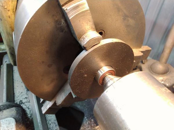 Подшипничек задавливается чуть-чуть пинолью задней бабки, а потом относится на пресс, где анимает своё законное место.