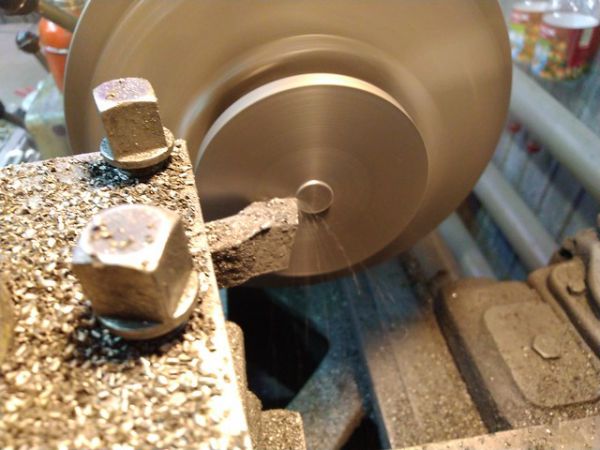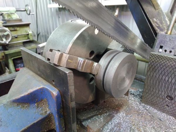 Проект начинается, разумеется, с поиска материала в отвалах у токарника. Одна беда - подходящая по диаметру бобышка имеет крайне невеликую длину, через что просто в ленточной пиле её хрен закрепишь. Но у меня же есть старый токарный патрон! Ноооорм. Получилось!