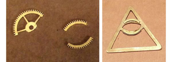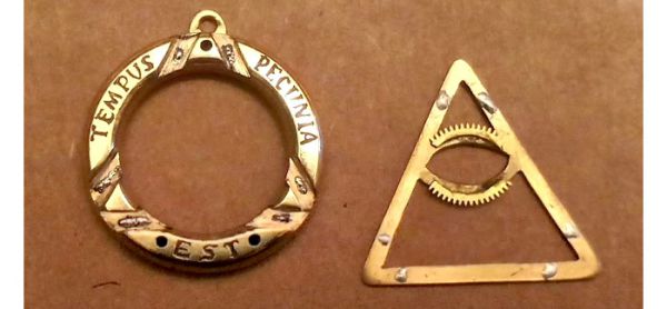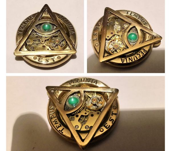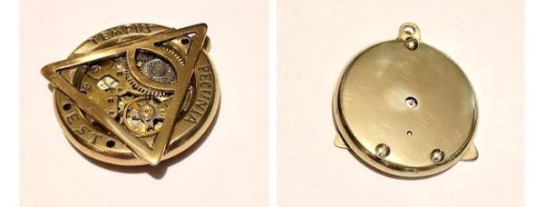 Осталось лишь вставить в корпус механизм, в око - линзу, и прикрутить заднюю крышечку, и работа завершена. Но когда я собрал конструкцию, мне не понравилось, как среди отполированной желтой латуни выделяются белые никелированные части механизма. Хоть я и не перфекционист, такое сочетание металлов в композиции меня не устроило, и тогда я решил разобрать механизм. Зачистил мосты от никеля и отполировал до зеркального блеска. Вновь собрал всё как было, и теперь золотистый блестящий механизм идеально вписывается в корпус из кольца с треугольником.