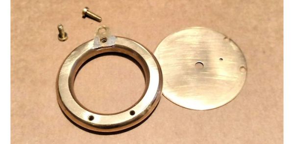 Далее займёмся корпусом и его задней крышкой. Вначале обтачиваем кольцо-корпус с обеих сторон, чтобы придать ему более плоскую форму. В качестве крышки для корпуса будет служить циферблат, подобранный по размеру и отшлифованный до блеска. Он имеет слегка выпуклую форму, поэтому я решил использовать именно его, а не выпиливать крышку из тонкого плоского куска латуни. Крепиться к корпусу он будет тремя мелкими винтиками, под которые высверлил отверстия в корпусе и нарезал в них резьбу. Вверху корпуса пропилил паз и впаял в него латунную петельку под кольцо или бэйл, чтобы подвешивать на шнурок (цепочку).