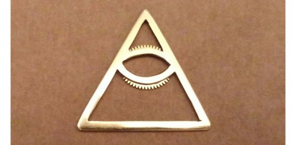 Переходим к треугольнику. Начертил его сначала на бумаге и вырезал, потом этот шаблон обрисовал на куске латуни и стал выпиливать. Внутреннюю часть треугольника с глазом выпиливал самым обычным лобзиком с очень тонкой пилкой. Думал, эта пилка не возьмет латунь, но не тут-то было: пилилось очень хорошо, и даже ни разу пилка не сломалась. Полученную фигурку тщательно обработал надфилями.