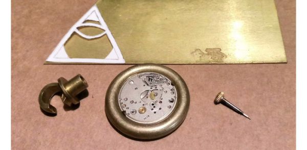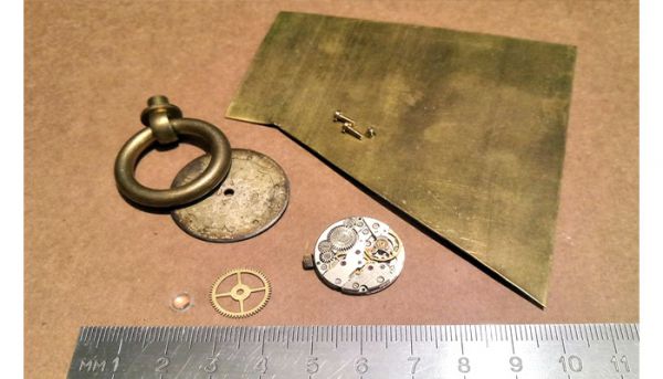Итак, процесс пошел. Покопавшись в своих железках, подобрал нужные мне детали и материалы. Как видите, их совсем немного: кусок листовой латуни толщиной 0,8 мм, латунная ручка-кольцо от дверцы шкафа, циферблат и механизм от старых советских часов, шестерёнка (хз от чего), линза от CD-привода и три латунных винтика М1,6. Больше ничего не понадобится.