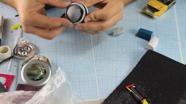 Вовнутрь поместил внутренности от самого дешманского фонаря, который только смог найти (82 руб.). Линзу вырезал из полторашки, наклеив сверху полоски из пластиковых стяжек.