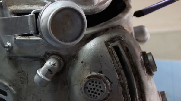 Ну и что бы весь шлем выглядел постарше я обильно развел водой черный акрил, обмазал им шлем и через минуту вытер. Остатки акрила оставшиеся в трещинах и на краске, должны создать вид изрядно потрепанного шлема.