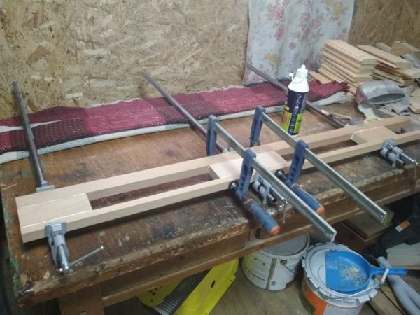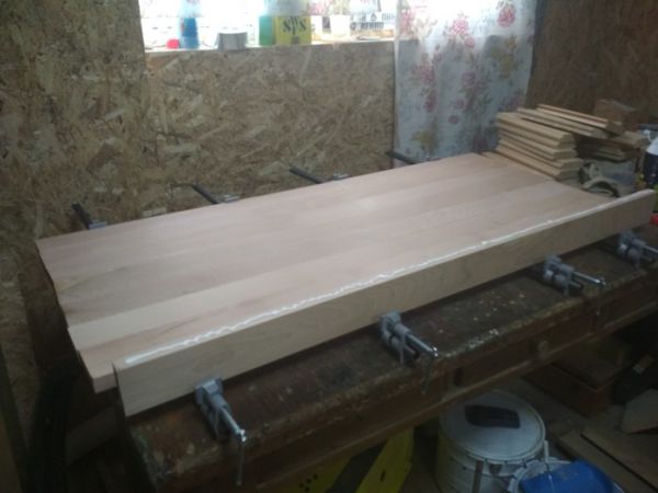 Сперва я решил склеить столешницу, для чего напилил и прифуговал делянки. Прессовку производил с помощью трубных струбцин.