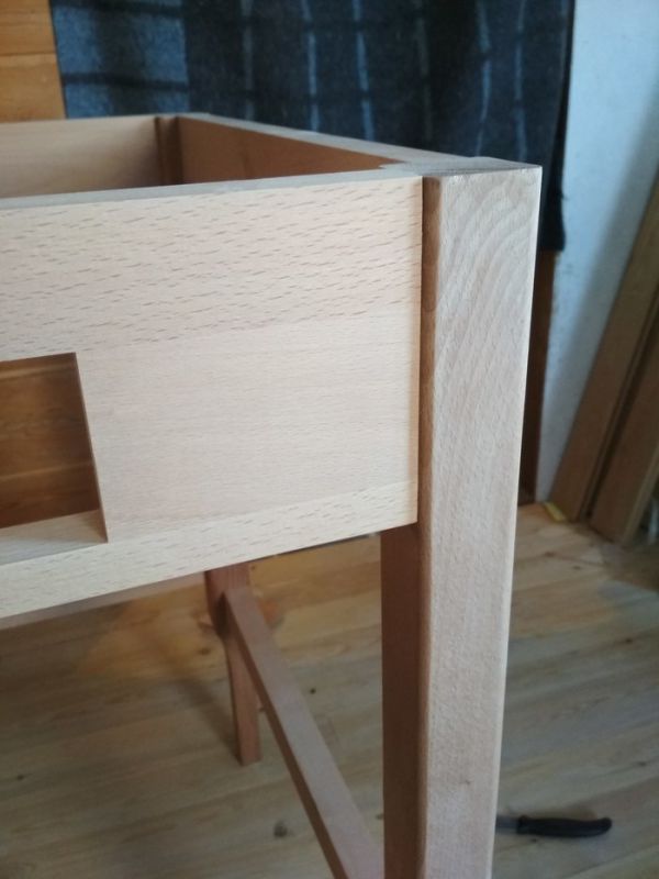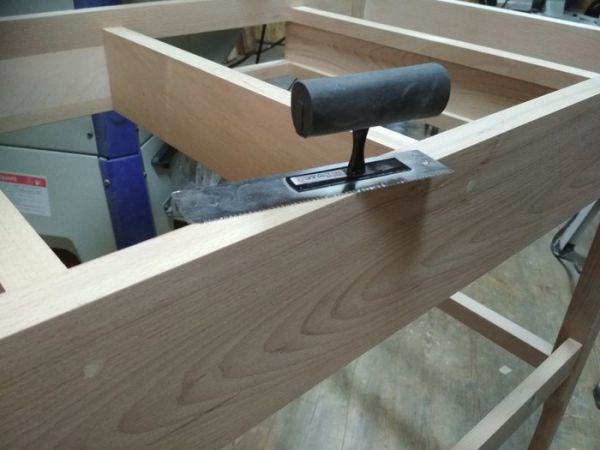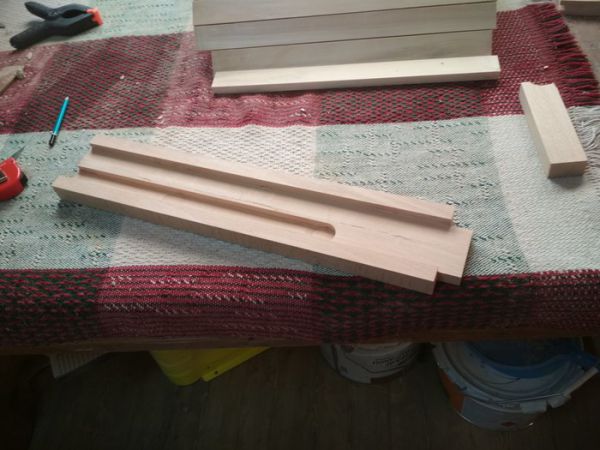 Как обычно не обошлось без косяков, пару раз я ошибся с глубиной фрезерования, но на работу направляющих это не повлияет. Четыре таких детали я вклеил в каркас. Соединение с передней царгой получилось за счет своеобразного шипа, а с задней я склеил в торец , а позже усилил это соединение сквозными шкантами.