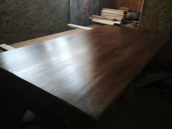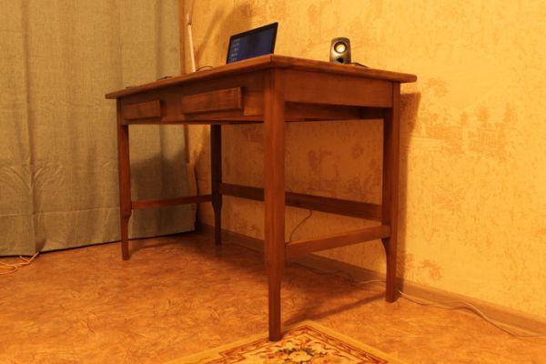 Такой внешний вид стола меня устроил, и я перешел к покрытию лаком. Покрывал кистью, и это было очень страшно, потому что я много раз слышал о том, что хорошо положить лак кистью практически невозможно. Но, промучившись целую ночь, я был в шестой раз приятно удивлен результатом. По-моему, получилось настолько хорошо, насколько я не мог даже мечтать.