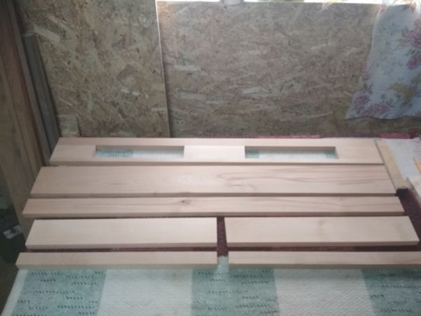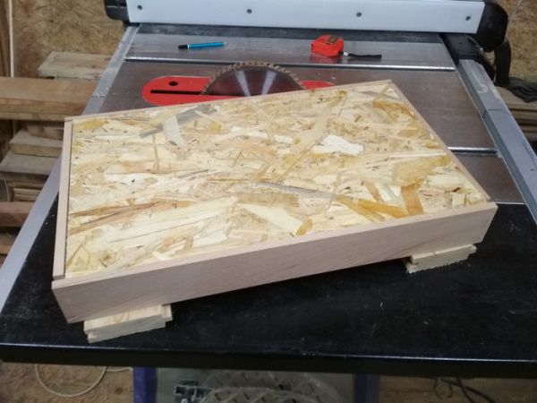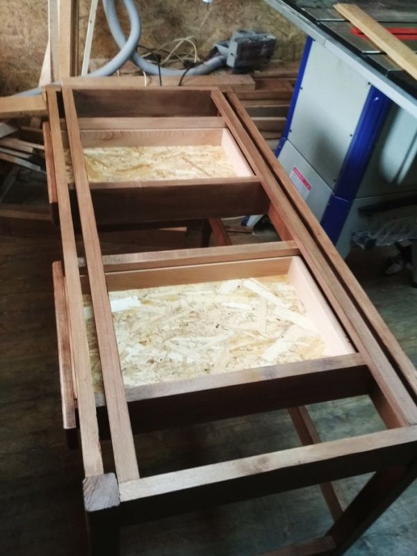 Ящики я склеил в торец и усилил шкантами. Дно сделал из обрезков осб-листа, в изобилии оставшихся у меня от постройки дома. Конечно выглядит он не очень уместно, но впоследствии дно ящика будет обклеено тканью.