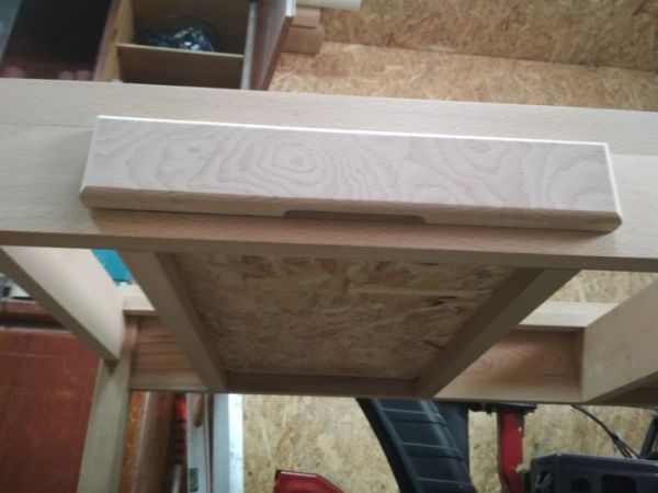 Пока сох клей, я начал продумывать конструкцию. Замысел мой был очень прост: я хотел уменьшить жесткость на кручение царгового пояса таким образом, чтобы он деформировался при установке стола на кривой пол, позволяя всем четырем ножкам встать на твердое. По моим оценкам, для этого достаточно ослабить жесткость всего одной царги, предпочтительно передней, так как именно она является наиболее нагруженной. Кроме того, мне нужно было придумать способ крепления столешницы, который позволил бы сохранить возможность деформации царгового пояса, но при этом был бы достаточно надежен. Переднюю царгу я склеил из 5 деталей.