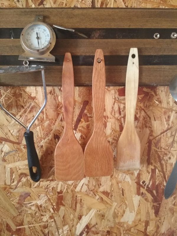 И мне это совсем не понравилось. Наверное фасады оказались слишком большими и толстыми и совсем не подходили к довольно тонким ножкам, поэтому я отпилил от них все лишнее, а из обрезков сделал пару лопаток на кухню, взамен совсем растрепавшейся старой лопатке, купленной лет 10 назад по акции вместе с дешевыми макаронами.