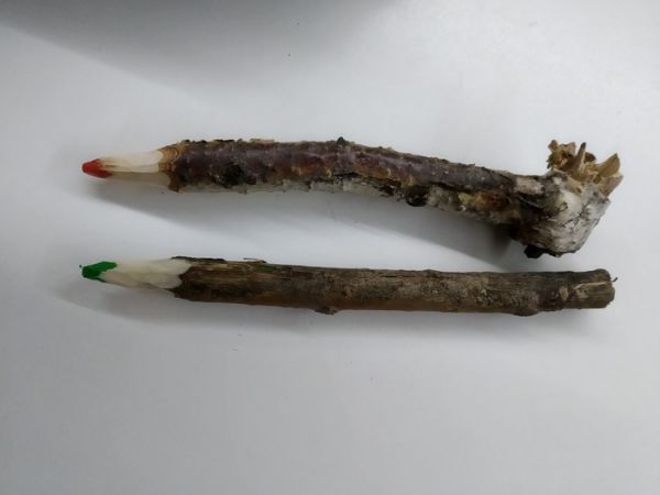 Разливаем по веточкам наливая в "воронку" примерно 1 см выше самой палочки т.к воск осядет при застывании. Даём остыть минут 20-30 и получаем: