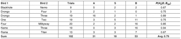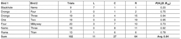 Результаты оказались довольно неожиданными. Как видно из таблицы, птицы показали склонность почти всегда смещаться вправо, хотя вероятность такого смещения сильно варьируется от особи к особи.