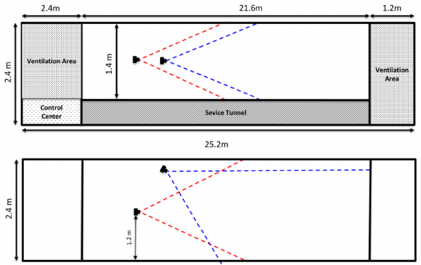 Испытательный туннель. Синими и красными пунктирными линиями показаны поля зрения камер наблюдения