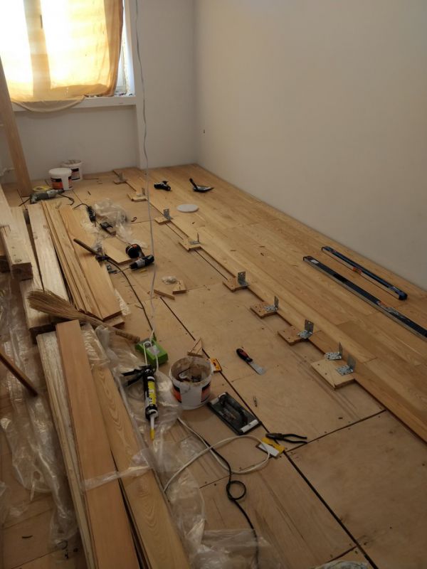 Каждую досочку я подбивал клиньями (часть доски по диагонали распилил, один из клиньев саморезами в пол, а второй молотком забиваешь, подбивая доску. Потом саморезом через уголки прижимаю доску, а потом уже креплю спец саморезами в паз.