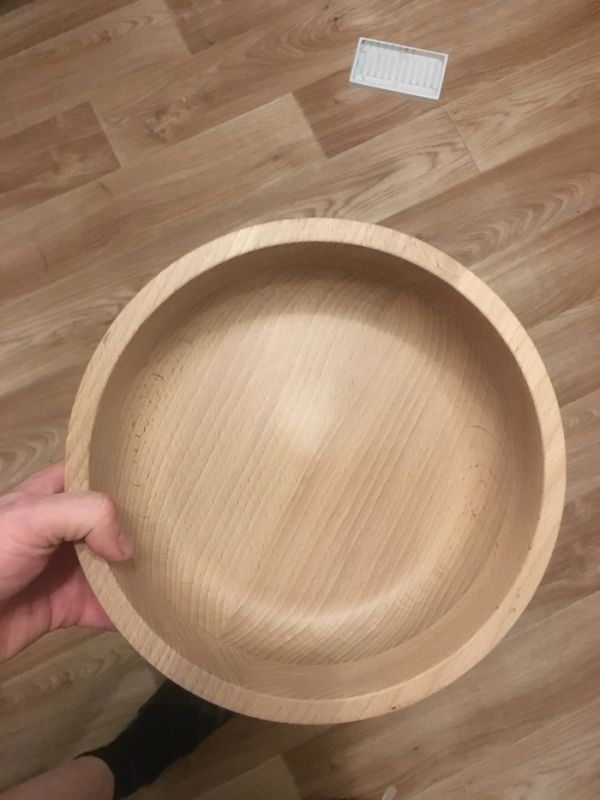 В итоге переделал заново крепление и больше она не рыпалась до конца. Такие диаметры конечно занимают гораздо больше времени и сил...но оно в кайф пока не добрался до шлифовки, на этом салатнике как раз переосмыслил весь процесс, поэтому отняла она без малого 3 полных вечера, причём 2 первых шлифовал пока шкурка держалась в пальцах. Однако желаемого достиг, салатник начал блестеть ещё до покрытия маслом: