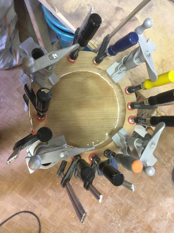 Лес струбцин, много клея и приятная компания. После этого поставил на станок, но заготовка оказалась норовистой и раза 2 от меня убегала...ну такое, когда 5кг начинают летать немножко, очко сжимается.