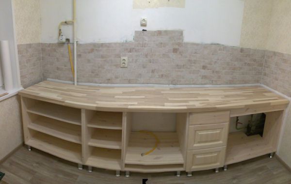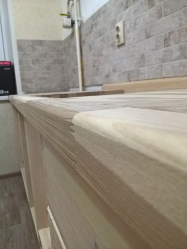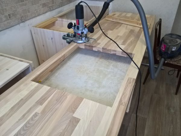 Дальше столешница. Выбрал ясень. Заказывал в интернете. В лифт не влезла, а тяжелая кошмар. Проёмы под варочную поверхность и мойку лобзиком не вырезать, очень твердая порода, древесина начинала дымиться. Циркулярки на тот момент не было, зато был ручной фрезер. Инструмент шикарный. Жаль поздно познакомился. Им же сделал закругление и каплесборник (его не видно). Дальше опять шлифовать. Хорошо хоть одна большая плоскость, не ёрзает от своего большого веса.
