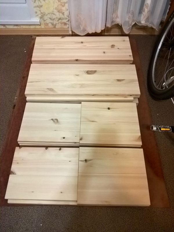 Это наверно 2/3 от всех корпусов, позже мне пришлось допиливать несколько раз. Пилил по паре-тройке часов в день. Дня за 3 управился. Дотошно замерял прост. Далее настало время обработки. Много много наждачной бумаги 120 зерно. И много много упорства. Если кажется что хватит то можно еще раз шлифануть. Лишним не будет. Этим я занимался около 4 дней вместе с фасадами. Туда сюда вдоль волокон. Далее - крыть. Я выбрал масло на уретановой основе белого цвета. Не хотелось желтизну. С этим даже школьник справиться. Нанёс подождал минуту, вытер.Далее. Фотографий сборки, к сожалению, нет. Всё крепил на шканты и полиуретановый клей, без возможности разбора отдельных корпусов. Делал так: мазал шканты клеем, и быстро собирал корпус. На уровне каждой полки стягивал шпильками с брусками чтобы плотнее стенки друг к другу прижались. Скорее всего есть проще способ, но у меня были шпильки, и это вполне себе рабочая конструкция.