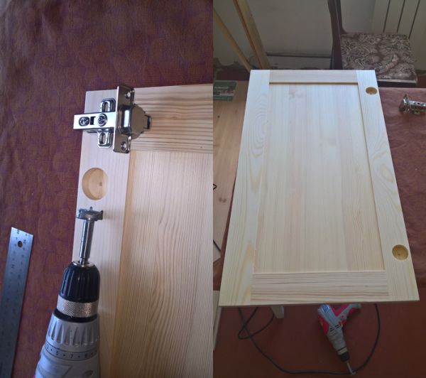 Фасады. Оказалось дешевле и быстрее купить из Москвы с доставкой стандартные, чем заказывать дома. Разница почти в три раза. Со сверлом форстнера под петли легко справился.
