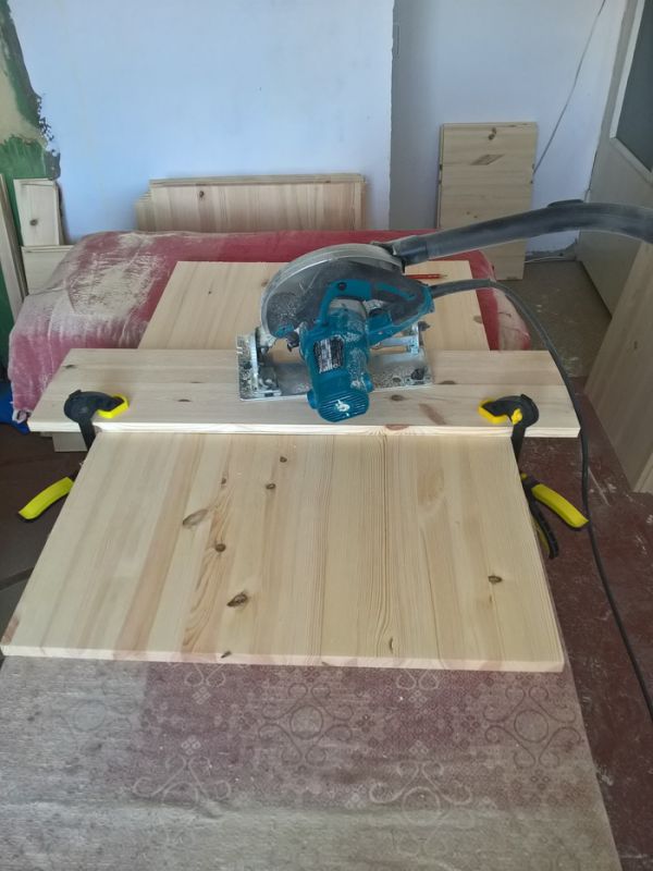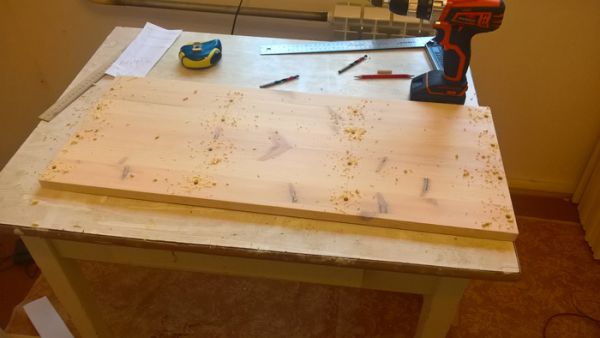 Началось всё с чертежа на листке бумаги. Кто то скажет можно начертить 3D. Ну я и начертил. По сути это было только для визуализации. В основном листком пользовался. Правки опять же быстро вносятся. Следующий этап выбор материала. В моем городе ассортимент не баловал. Были мебельные щиты сорта А. Но как то скучно он выглядел и склейка ламелей ёлочкой наружу, некрасиво, да еще и дороже. Уже потом я понял что ёлочку я почти нигде бы не видел на готовой кухне. Выбрал сорт Б с сучками, но ламели на всю длину.Фото целых нет. Длина 2400*600*18 уже не помню сколько. Вот начало процесса:
