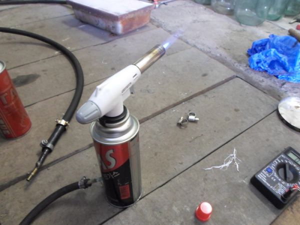 После крана я использую переходной китайский баллон с впаянной трубкой,на который можно надевать горелку или вставлять его в туристическую печку.