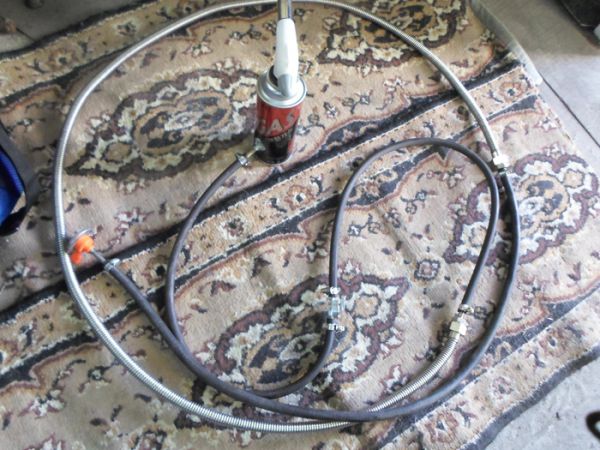 Испаритель представляет гофрированный металлический рукав длиной 3 метра с фитингами и продается в магазинах для подводки газа.В него вкручены два фитинга на полдюйма с ершом под резиновый шланг для газа диаметром 6 мм.На фитинги надеты два отрезка сварочного рукава длиной по 1 метру.Со стороны входа на рукав надет переходник под баллончик,сделанный из обрезанной газовой горелки с краном.