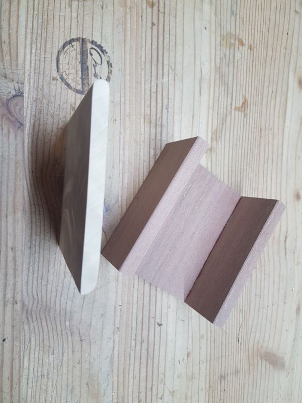 Пилим в размер заготовки и клеим "подкову" из сапеле. Мне попался бледно-розовый обрезок, вся надежда на то. что масло его украсит. А вообще такие вещи лучше покрывать морилками.
