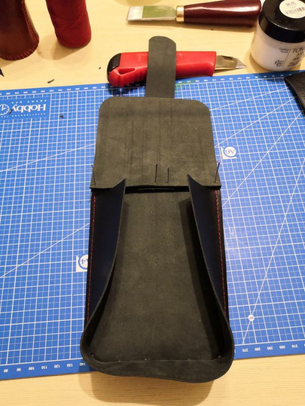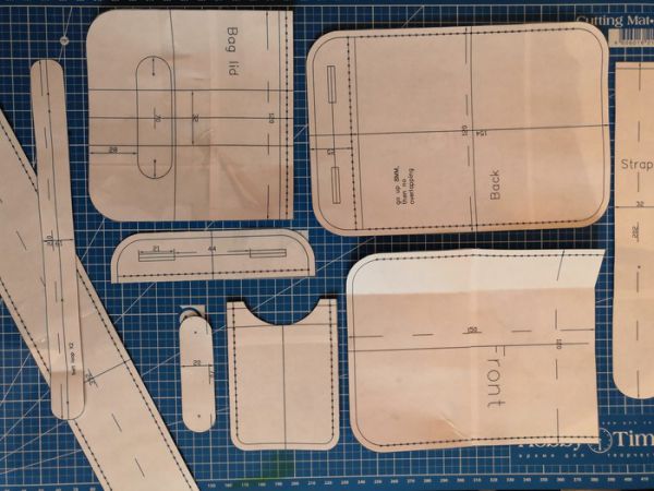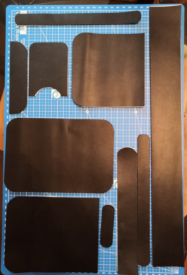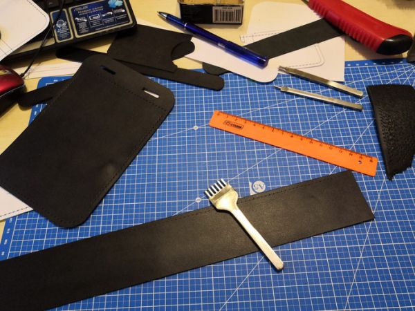 Переносим на кожу и вырещаем все детали. Далее размечаем место под шов и пробиваем все детали.