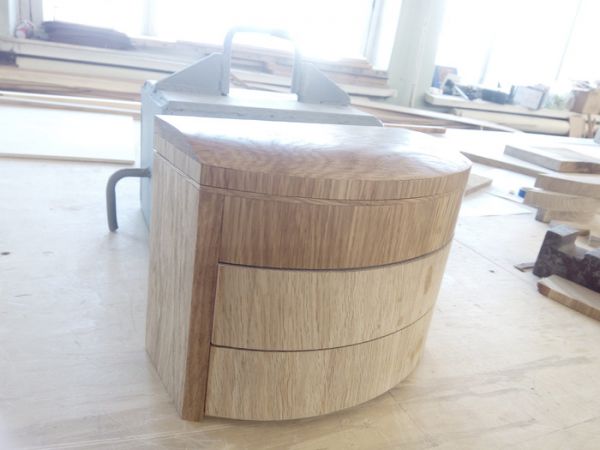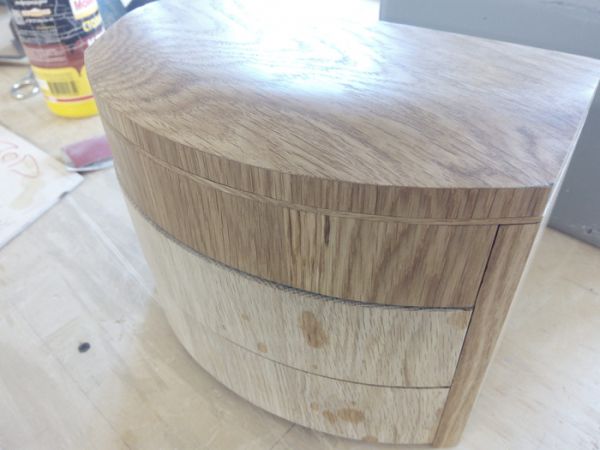 Вот и причина того, что ящики делал в первую очередь. Шкатулку обрабатывал в 2 этапа. 1-й этап в сборе с ящиками - что бы радиус везде получился одинаковый. 2-й этап - уже с приклеенными фасадами.