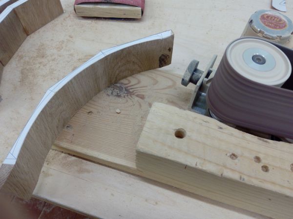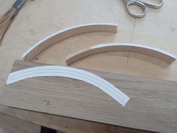 Взял всю ту же дюймовку и выпилил радиусные планки. По 2 шт на ящик. То что на фото из елки не смотрите - то для пробы было) Выпиливал лобзиком. Брать доску толще я бы не рекомендовал, даже 20-ку дубовую лобзиком пилить ровно тяжело, если толщина больше - пилку лобзика загибает, и пил получается в вертикали не ровным, а так как толщина планок 5 мм, то скос 1-2 мм это уже очень много.