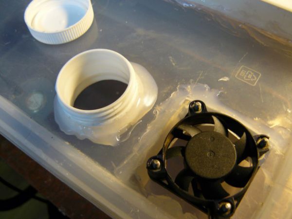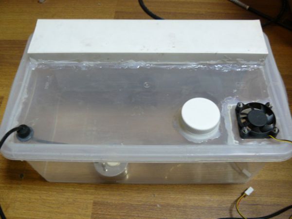 отвлечемся на внутренности. Из контейнера из Икеи, китайского ультразвукового парогенератора и пластикового короба пилим такую конструкцию.