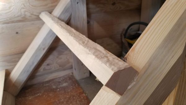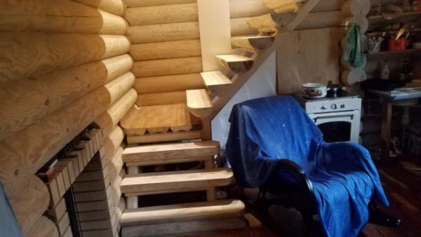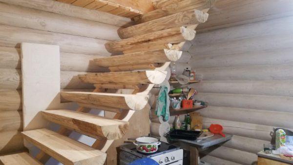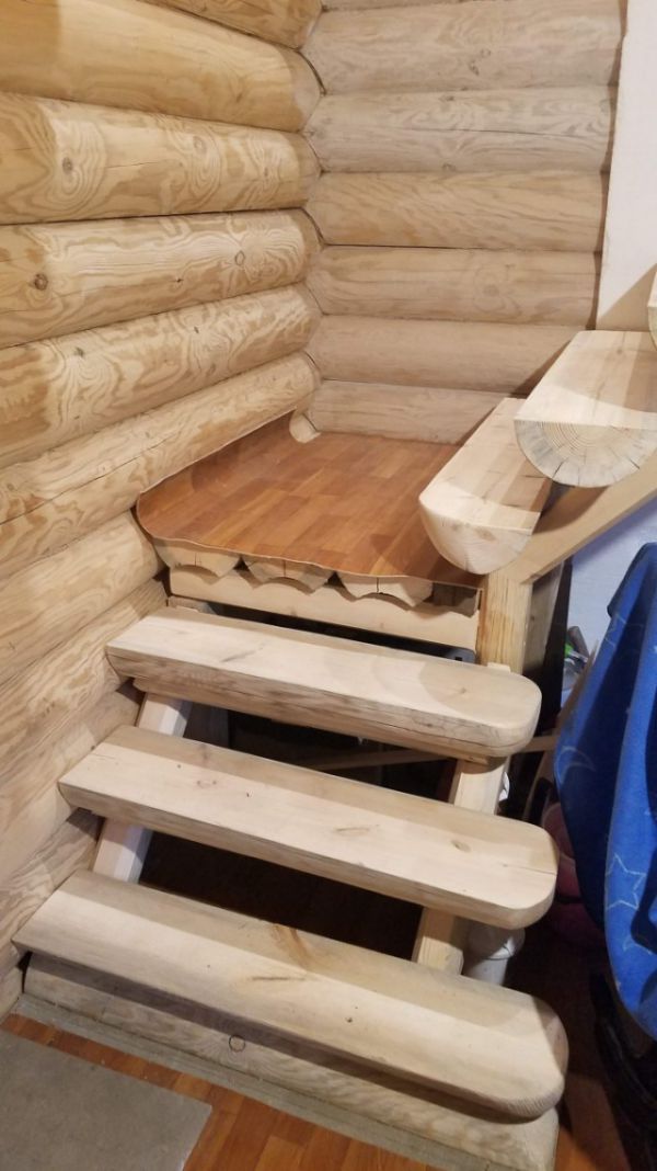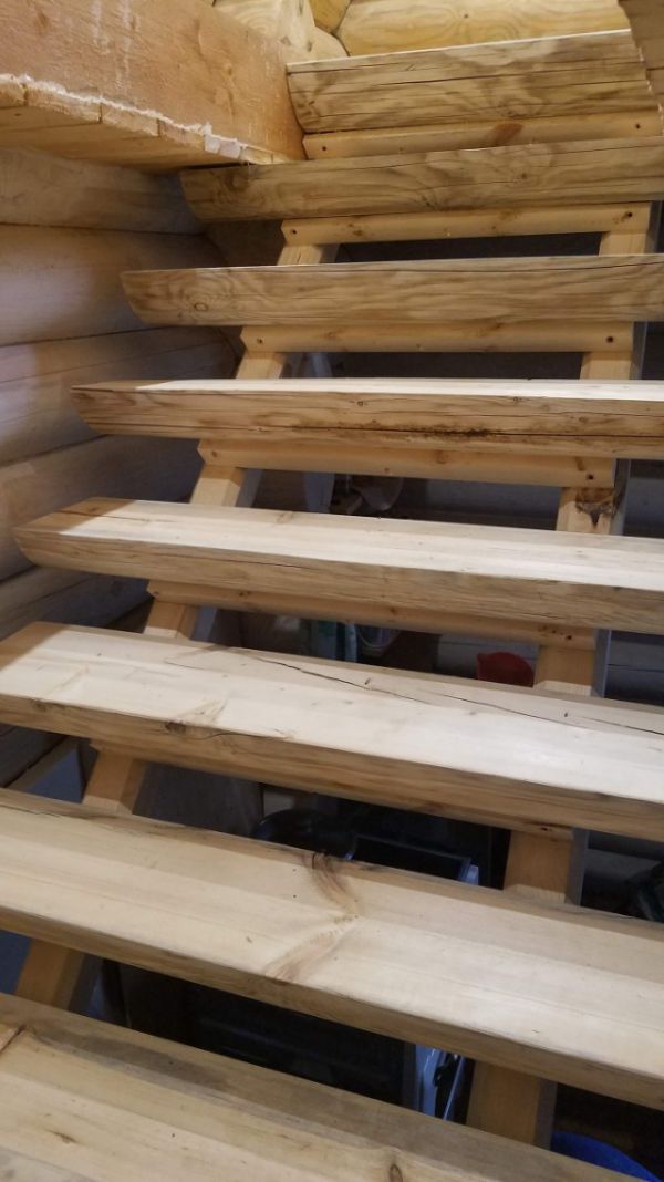 От строительства дачного домика осталось очень много оцилиндрованного бревна. А вот лесенки на 2 й этаж не было. В магазине , готовая, стоит от 43 тыс. Жаба меня просто задушила. Решил сам что то придумать из остатков.