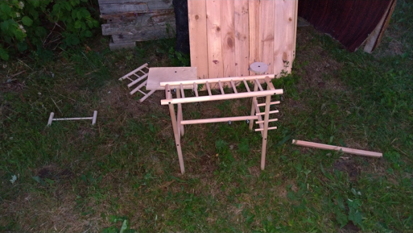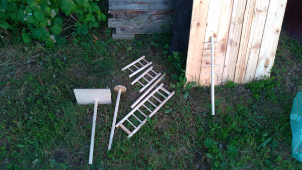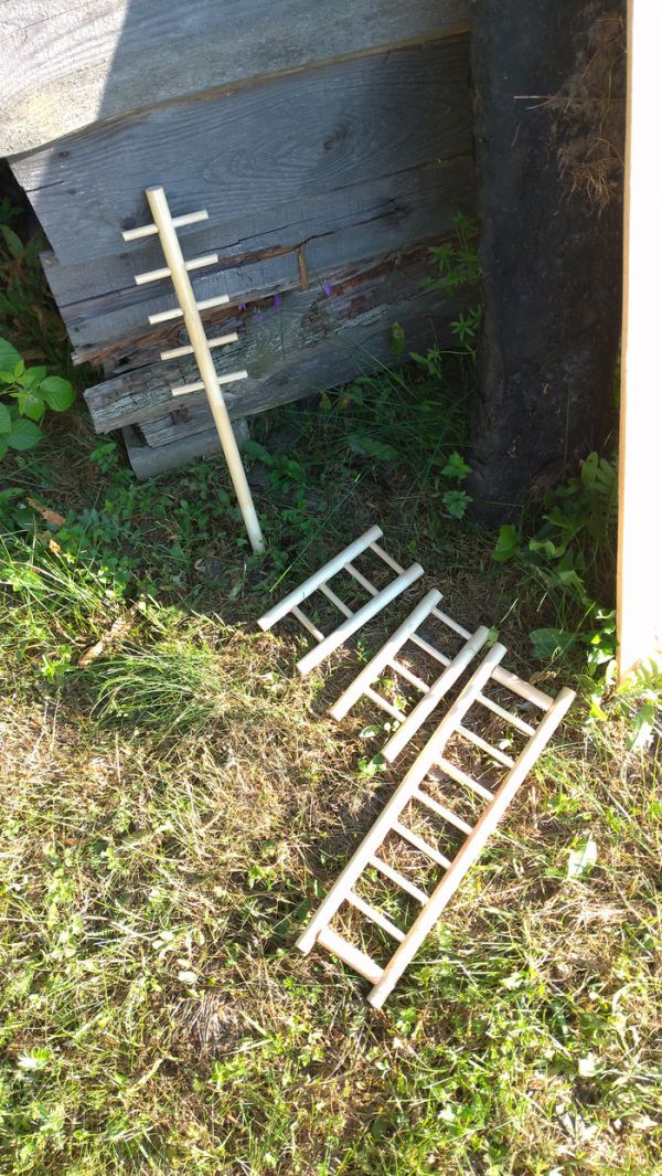 После приезда на дачу, работа закипела, стояла жара, но интерес был сильнее неудобств. Для начала было решено собрать самую сложную лесенку, а сложную, потому что надо соблюдать безупречную ровность. На вертикальной опоре просверливаются ровные вертикальные отверстия и внутрь вставляются поперечные перекладины. Но нет сверлильного станка и никаких приспособлений для идеальной вертикальности. Поэтому после сверления, отверстия были расширены для того, чтобы перекладины можно было выровнять на клею, который появится позже. Боковины отпилены под нужный размер и ступеньки, хоть и вышли немного разной длины, но готовы. В боковинах просверлены отверстия до середины, где и будут держаться ступеньки (поэтому погрешность в ровности краев не критична, они будут скрыты внутри боковин). По краям закрепляем саморезами - тогда ещё не был куплен клей.