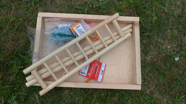 С дном площадки и вовсе всё просто: отпиленные боковины сбиваются между собой и прикручиваются к фанере снизу саморезами. 2 маленькие лесенки сделаны по тому же принципу что и большая, только держатся они уже на клею.