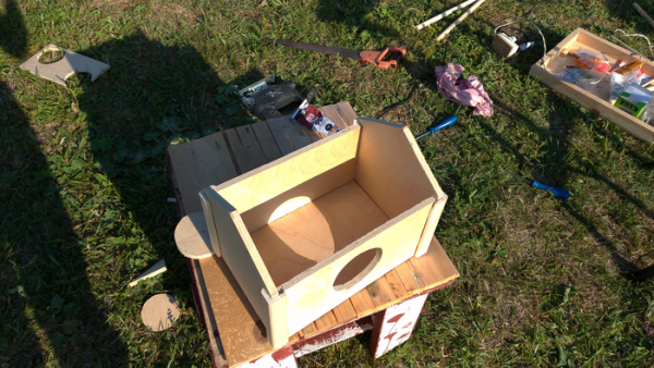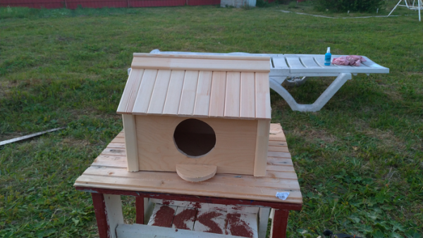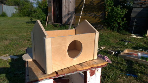 Вот и пришло время делать домик. Поскольку на фото с которого я делал всё максимально похожим, не было детальной конструкции домика пришлось внести некоторые коррективы, которые даже, как я считаю пошли на пользу. Главное всё верно расчертить, а отпилить это уже другой процесс. Разметка и распиливание заняло достаточно много времени – материалов то много, на одну крышу сколько ушло. Всё это соединилось и склеилось, а где-то внутри усилено маленькими саморезами, чтобы всё склеилось и не развалилось – зажимов тоже не было. У дома съёмная крыша, чтобы можно было наблюдать за попугаями и убираться там. Хотя уже изначально было ясно, что они не залезут в ограниченное пространство, но скорее это на будущее.