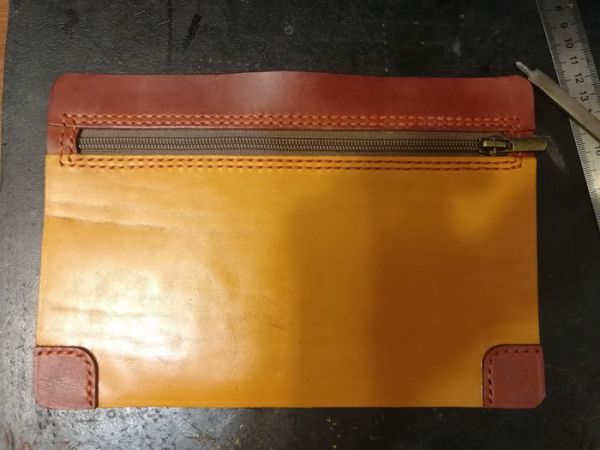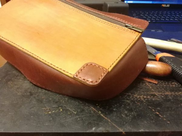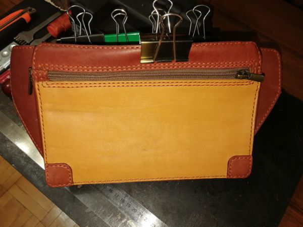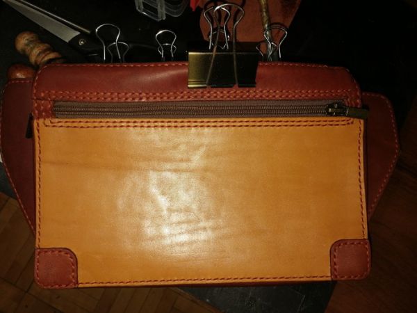 Вырезаем "лицо" сумки, которое будет из двух цветов кожи, обрабатываем её специальной мастикой (о ней я расскажу в отдельном посте), намечаем и пробивает отверстия для шва, далее приклеиваем молнию. Сам процесс фотографировать не стал, если будет интересно, то опять же будет отдельный пост.