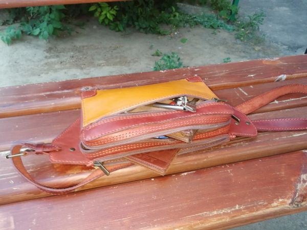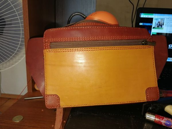 А дальше самое нудное: вырезать ремешок, пробить, прошить, отполировать торцы. К левой части приклеиваем и ставим на клепки сам ремешок, к правой части сибираем приклеиваем и ставим на клепки короткий ремешок с пряжкой. В общей сложности на эту сумку я потратил 5 дней. Вот сам итог. Комментируйте, сиавте плюсы, задавайте вопросы. Буду рад. Пара комментариев для минусов будет внутри.