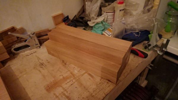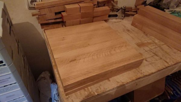 На крышку беру теже доски 50мм толщиной и ~500мм длиной (самый дешёвый материал), фугую, 90 и пилю на ламели по ~26мм. Дальше вывожу на рейсмусе в 22мм толщиной.