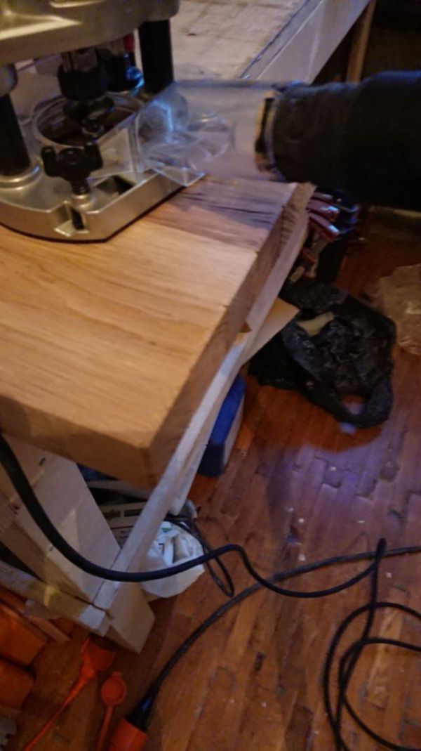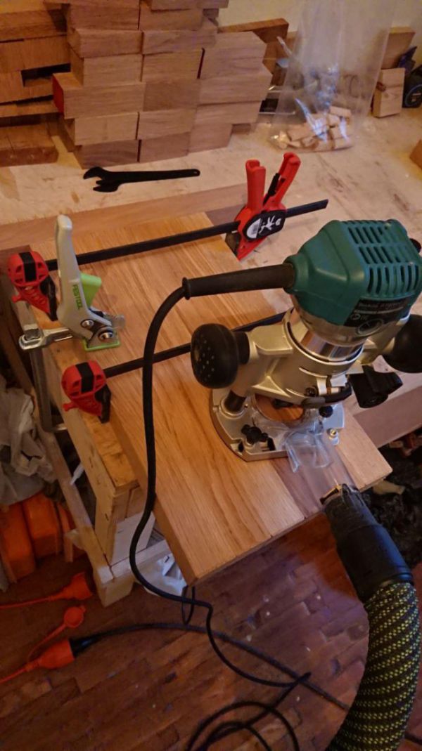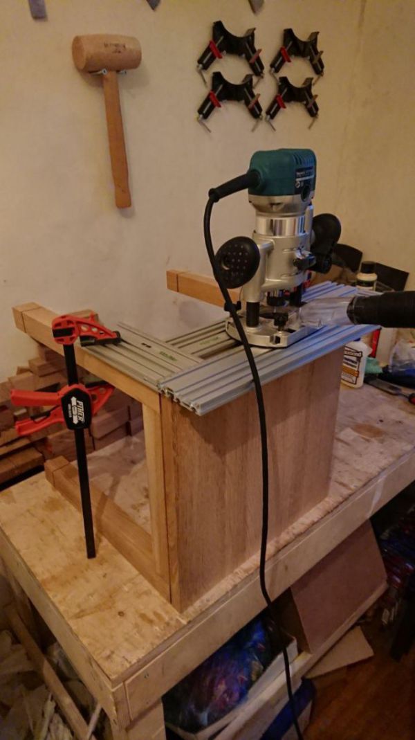 Сжимаю ножки струбцинами, прихватываю к столу и делаю скос с одной стороны фрезой 45 градусов: