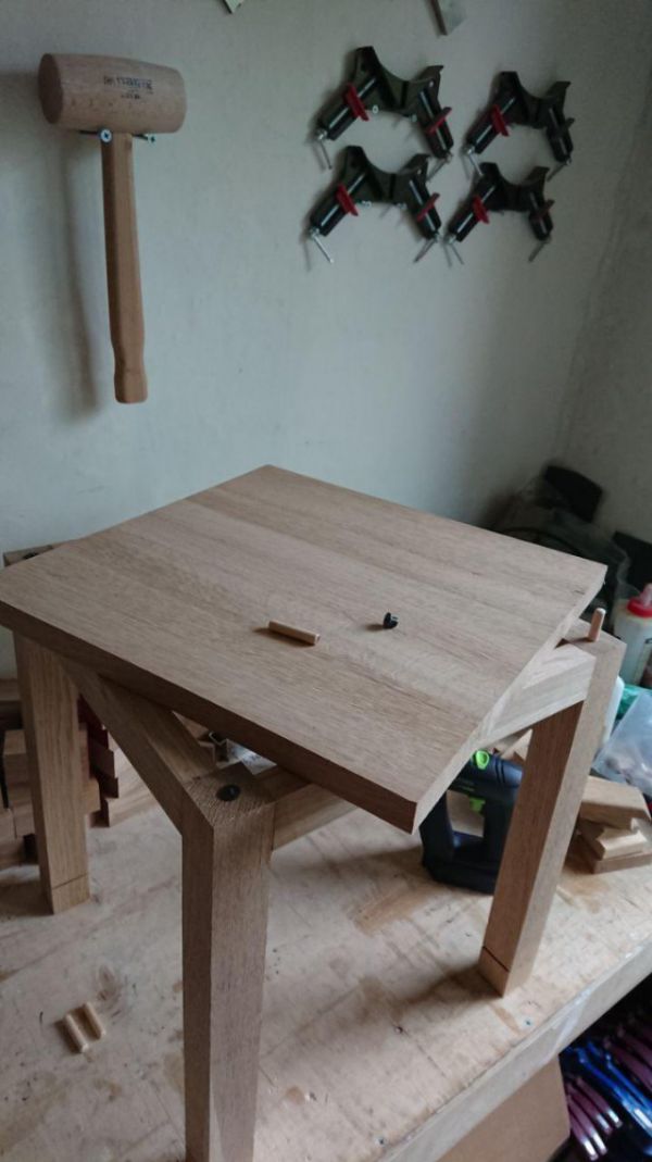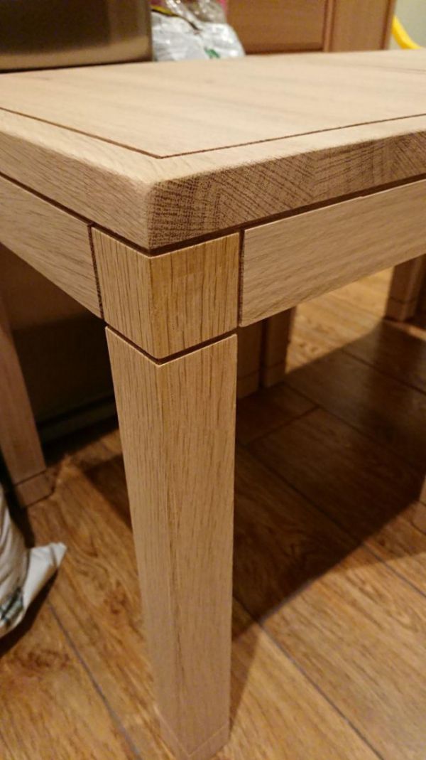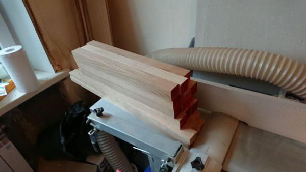На ножки беру 50мм толщиной, длиной ~500мм и шириной ~100мм неструганные доски дуба. Фугую с одной стороны, делаю 90 градусов на фуганке, пилю пополам на циркулярной пиле. Потом фугую опять и вывожу в размер 40x40 на рейсмусе.