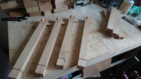 На царги беру доску 50мм толщиной, длиной ~700мм и шириной как получится. Фугую с одной стороны, делаю 90 градусов на фуганке, пилю на ламели 30мм (толщина царги с запасом), фугую опять и вывожу в размер 25x40 на рейсмусе. ~700мм потому, что потом получится две царги по 300мм.
