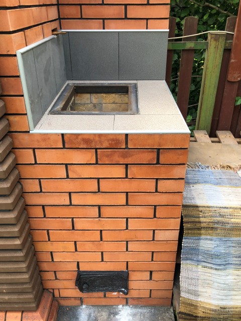 положили чугунную плиту для казана и отделали керамогранитом стенки