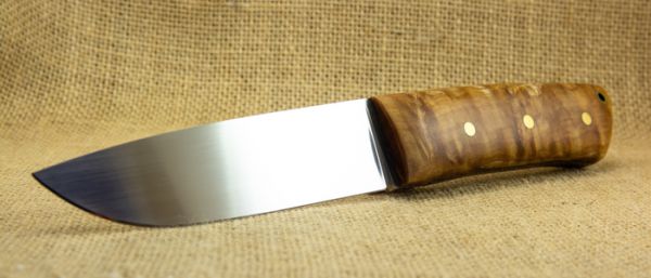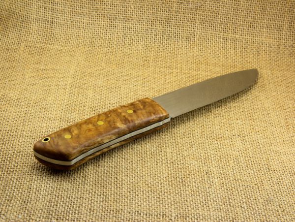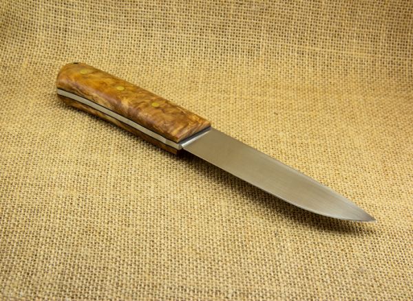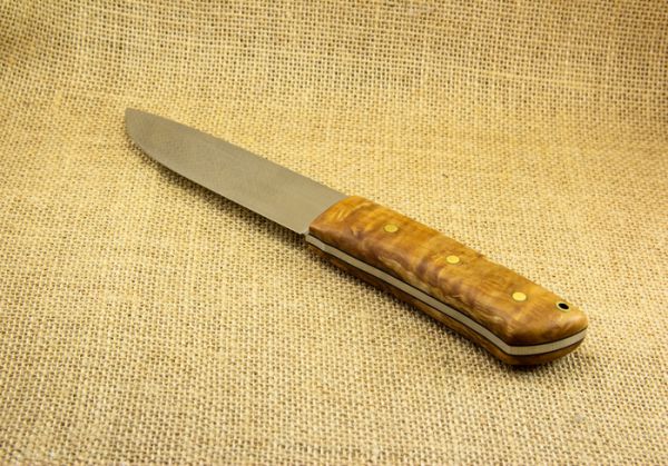 Нож сделал по просьбе друга, в подарок его отцу. Немного характеристик: Сталь 95х18, рукоять - стабилизированная карельская береза, проставки из фибры. Латунные штифты и трубка под темляк/шнурок.