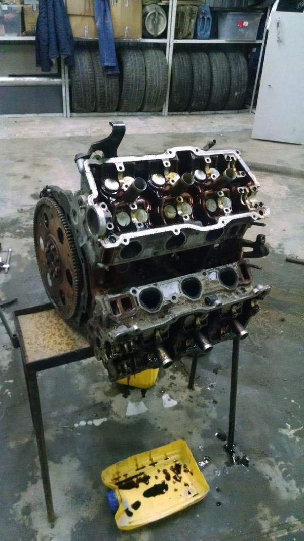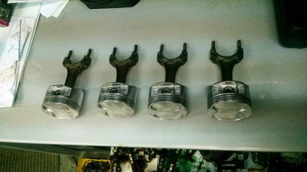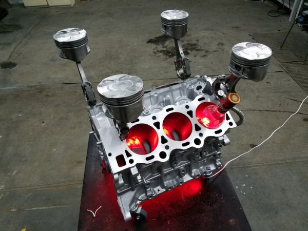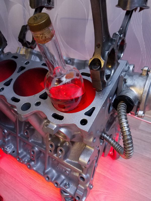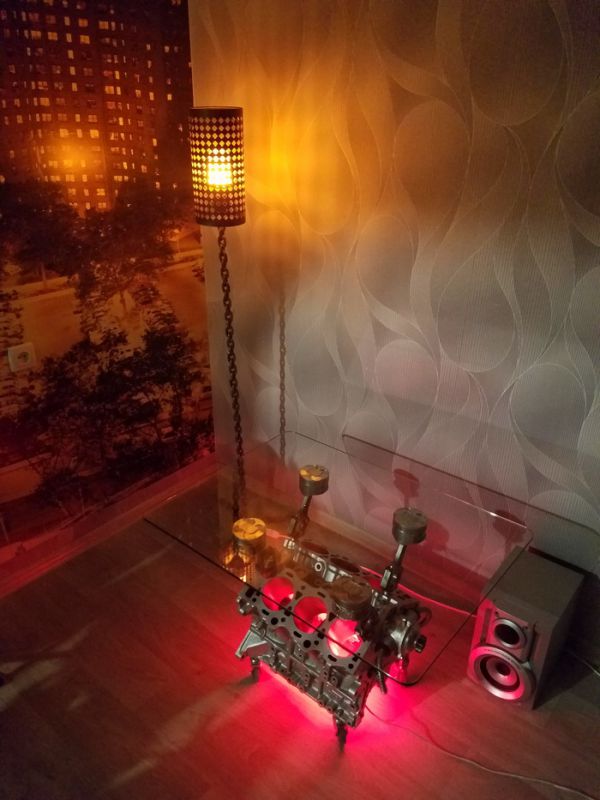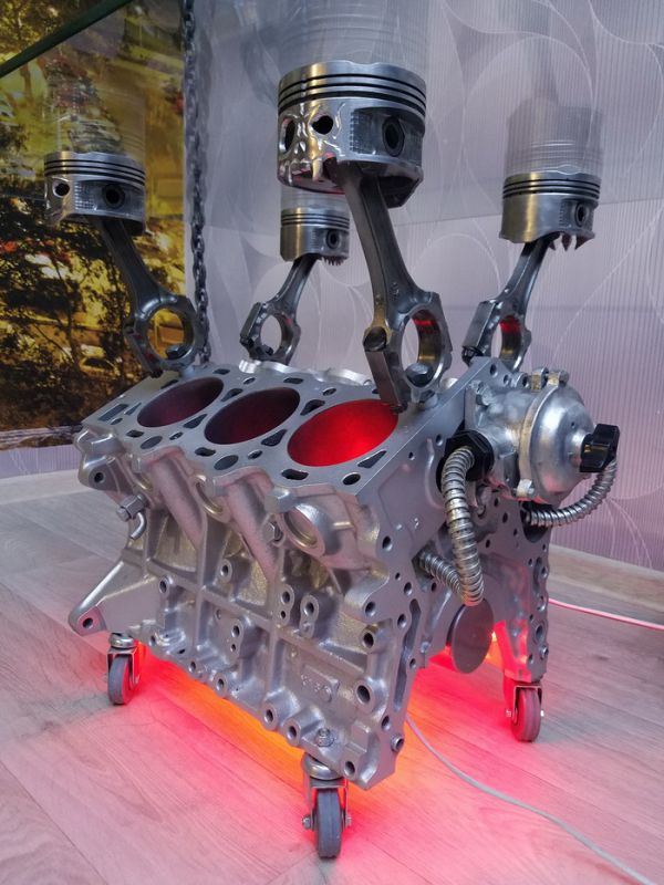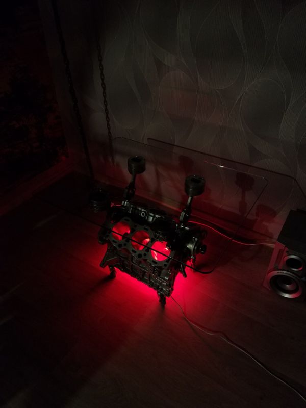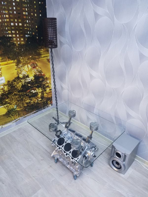 Года три как собирался сделать стол из двигателя. И вот знакомые бесплатно подогнали движок от Тойоты. Разобрал до болтика, отпескоструил, загрунтовал. Покрасил в металлик. Поршня отмывал химией, затем дремелем вырезал на них черепочки.